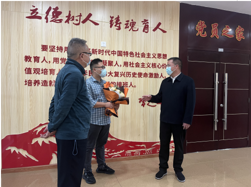 2022年5月9日上午,学院党委书记王建新,院长马洪,党委委员、组织部部长张正亮前往统计系慰问刚刚回校返岗抗疫一线教师志愿者罗平老师。